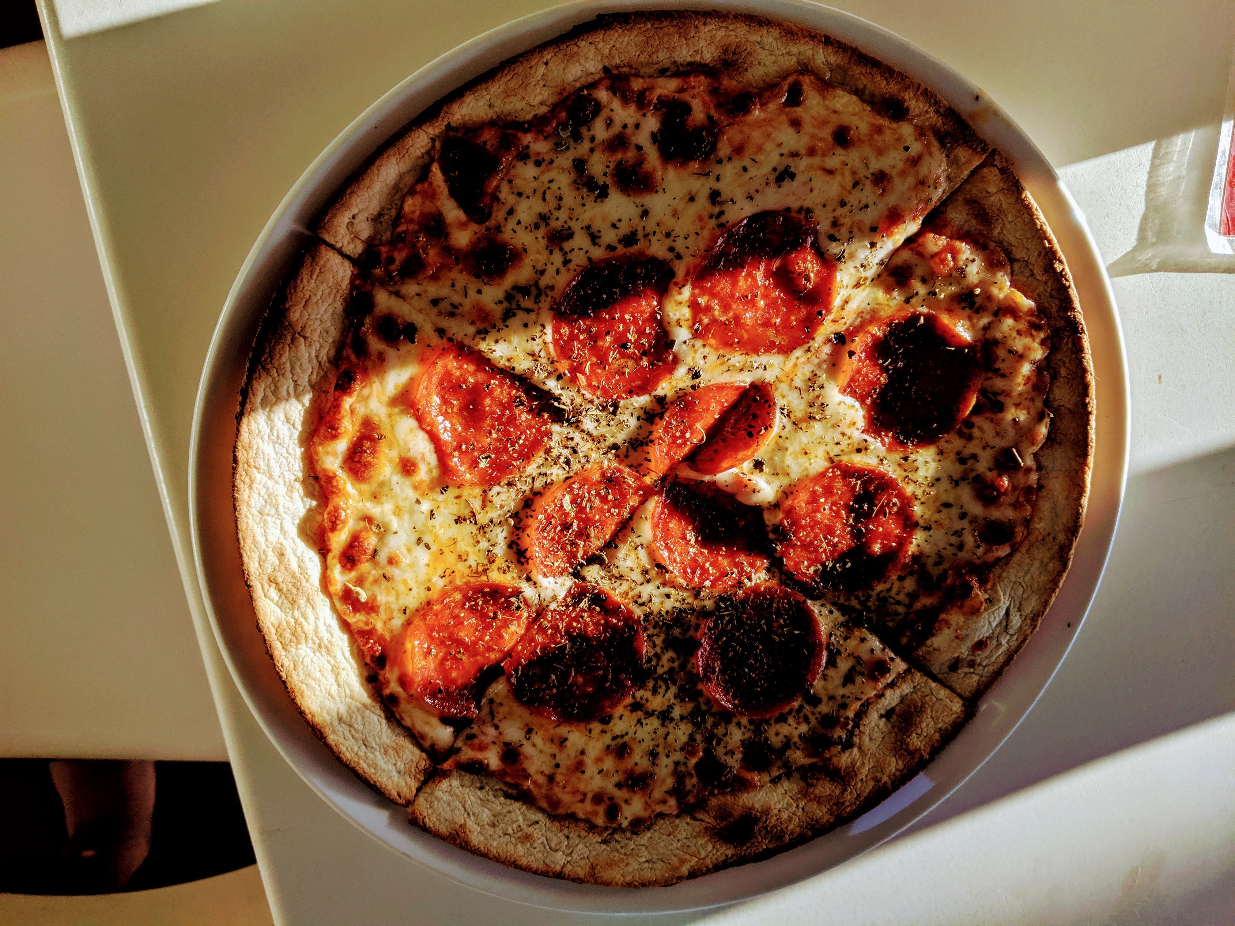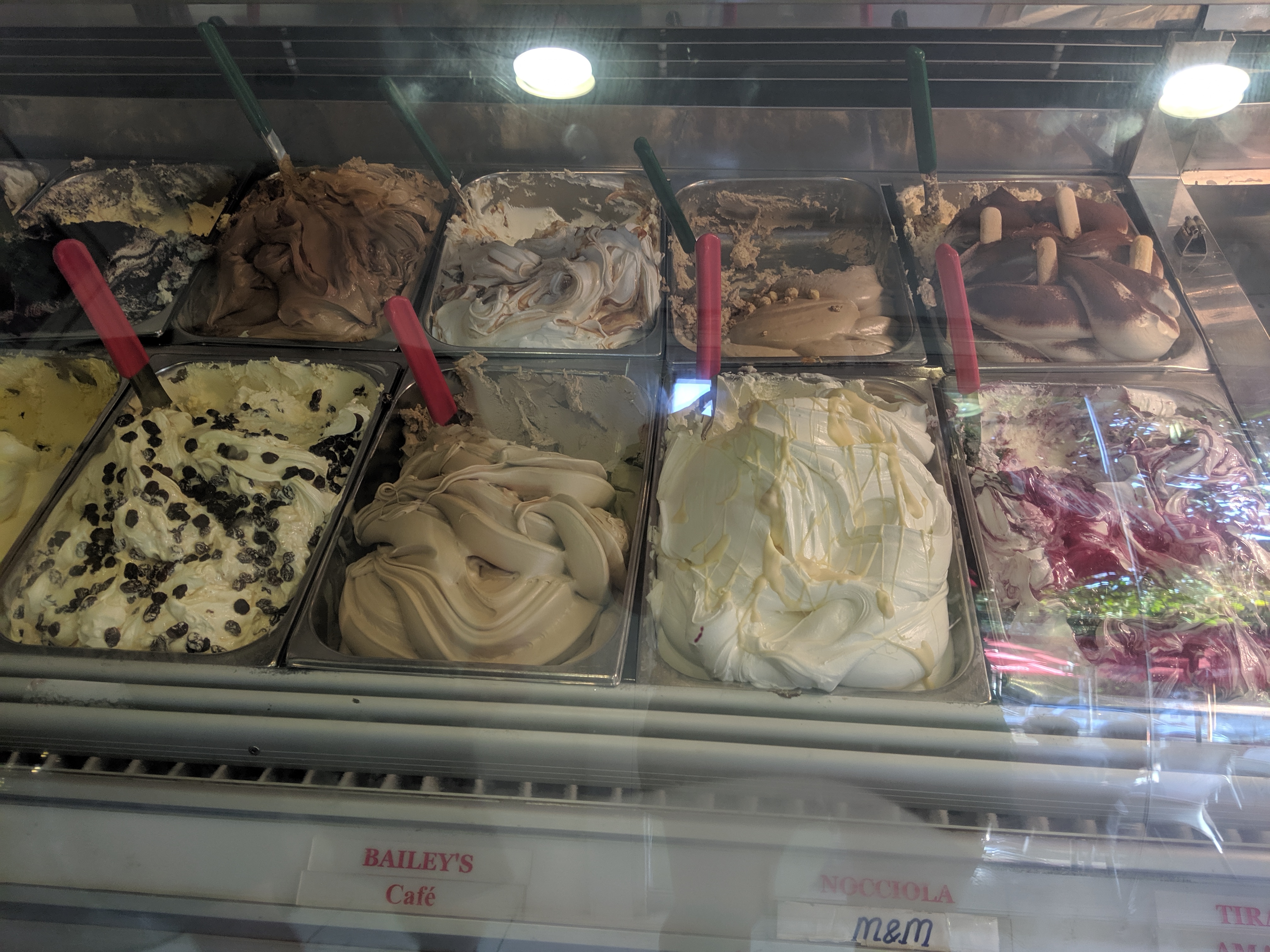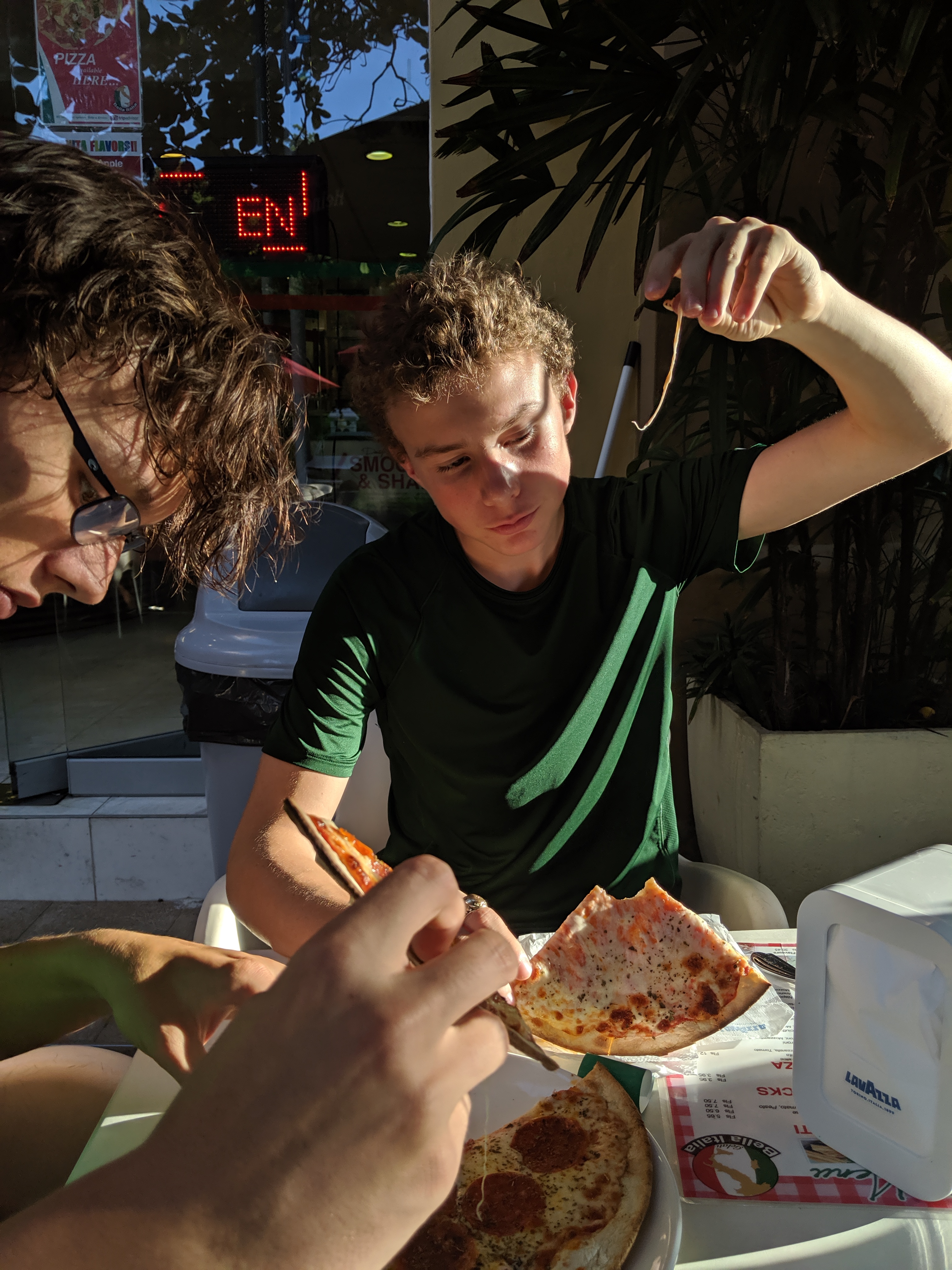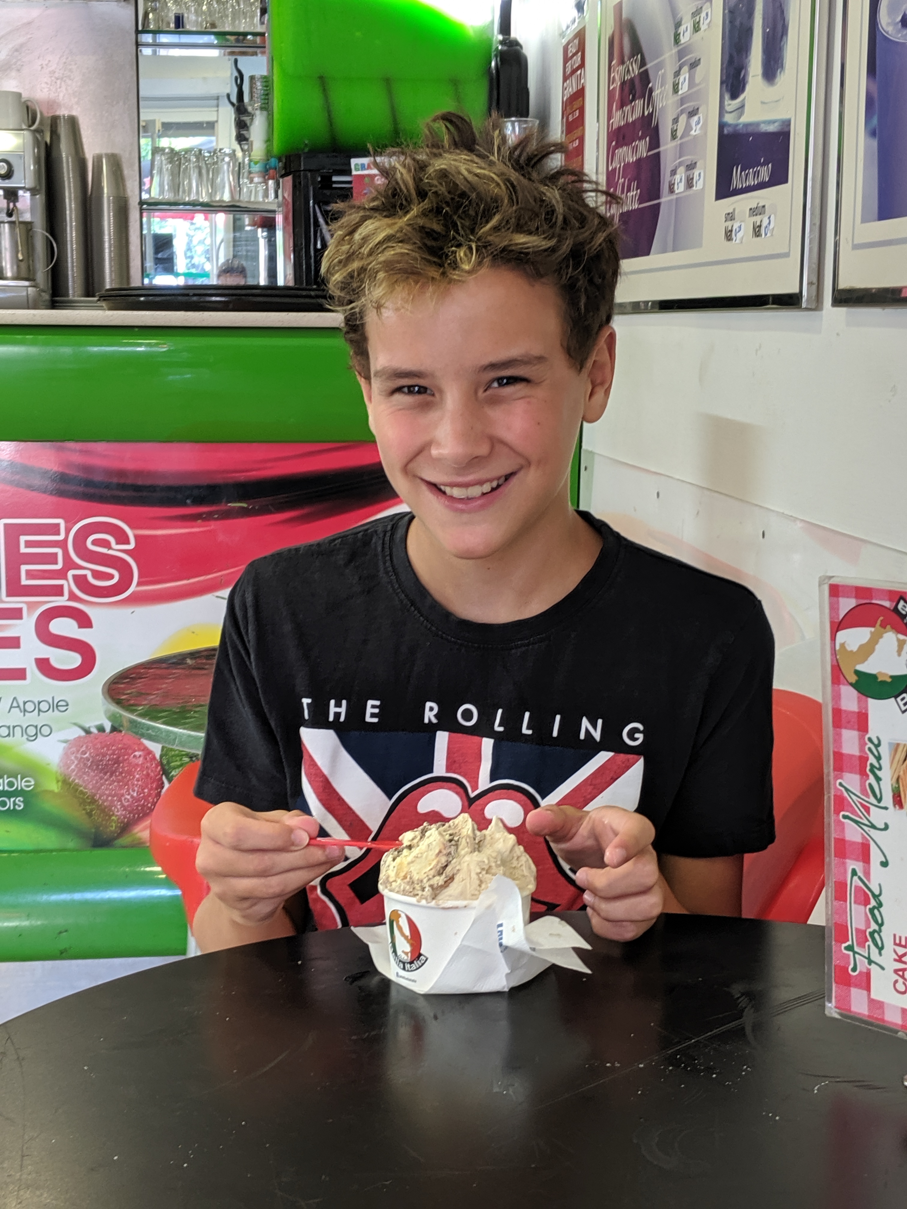 The older two decided they wanted the homemade pizza instead. They shared one pizza (four slices) as a pre-dinner snack. The pizza was delicious, according to the kids. I took a quick grab of some of the freshly melted cheese (since I can’t eat the gluten crust), and I concurred. One of my favorite parts of Gelati Bella Italia is that they have nice outdoor seating, so we could enjoy the tropical breeze.