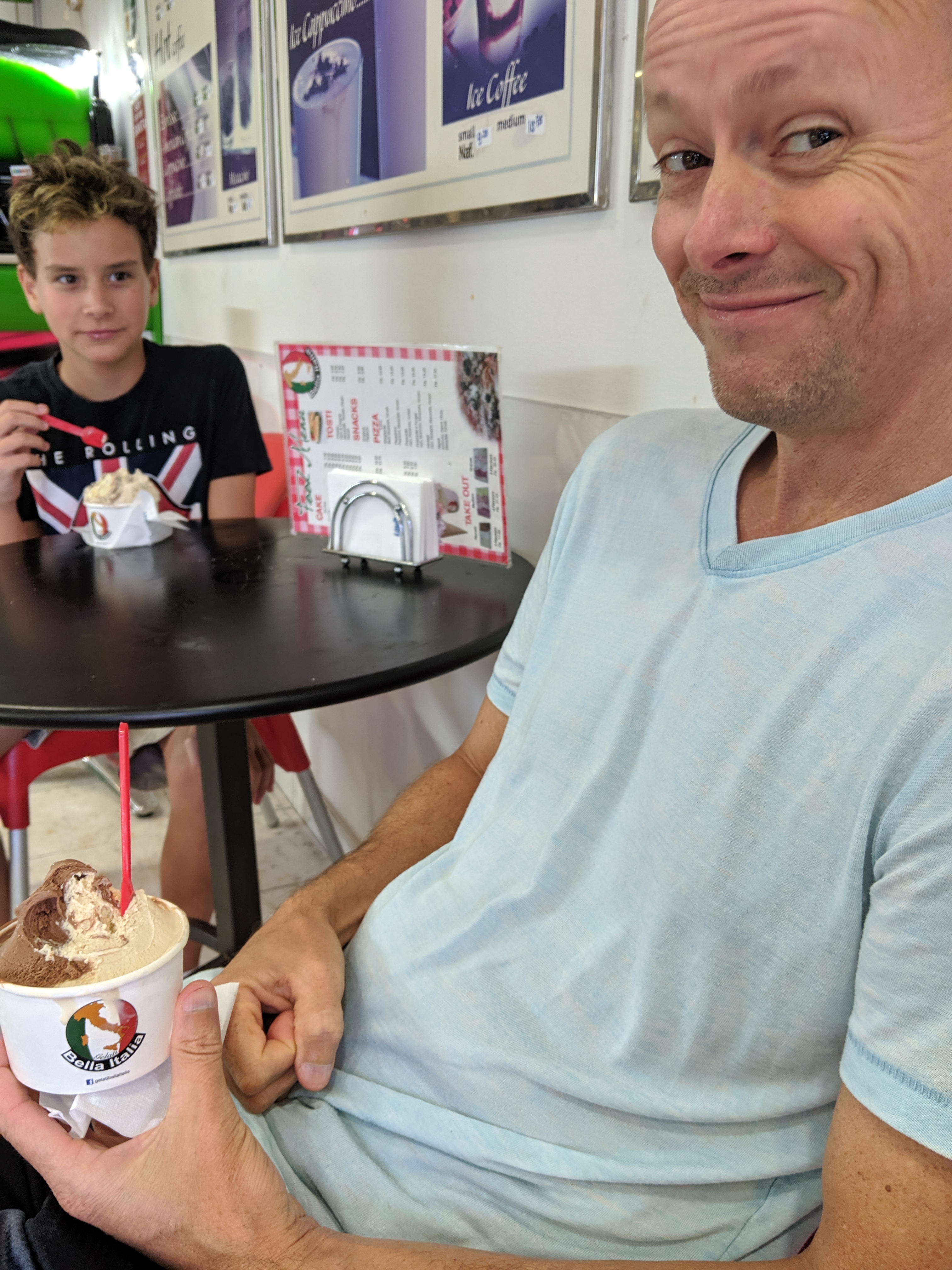 Our first place to explore was Gelati Bella Italia in the Zuikertuin mall. Truth time, the gelato caught our eye first! We are a family of ice cream lovers. Cody and I had been to Barcelona and immediately fell in love with gelato (every night), but the kids had never had it before. They have a pretty large variety of flavours, so Rhys took his time deciding. I was surprised he didn’t go with the cafe flavour, as he loves coffee and caramel. He opted to get a mix of oreo and chocolate, which was not a shock. Cody chose chocolate and peanut butter (I snagged a bit for myself). Both loved what they got. Cody was just upset he didn’t order the large, but I didn’t give him enough money for that.
