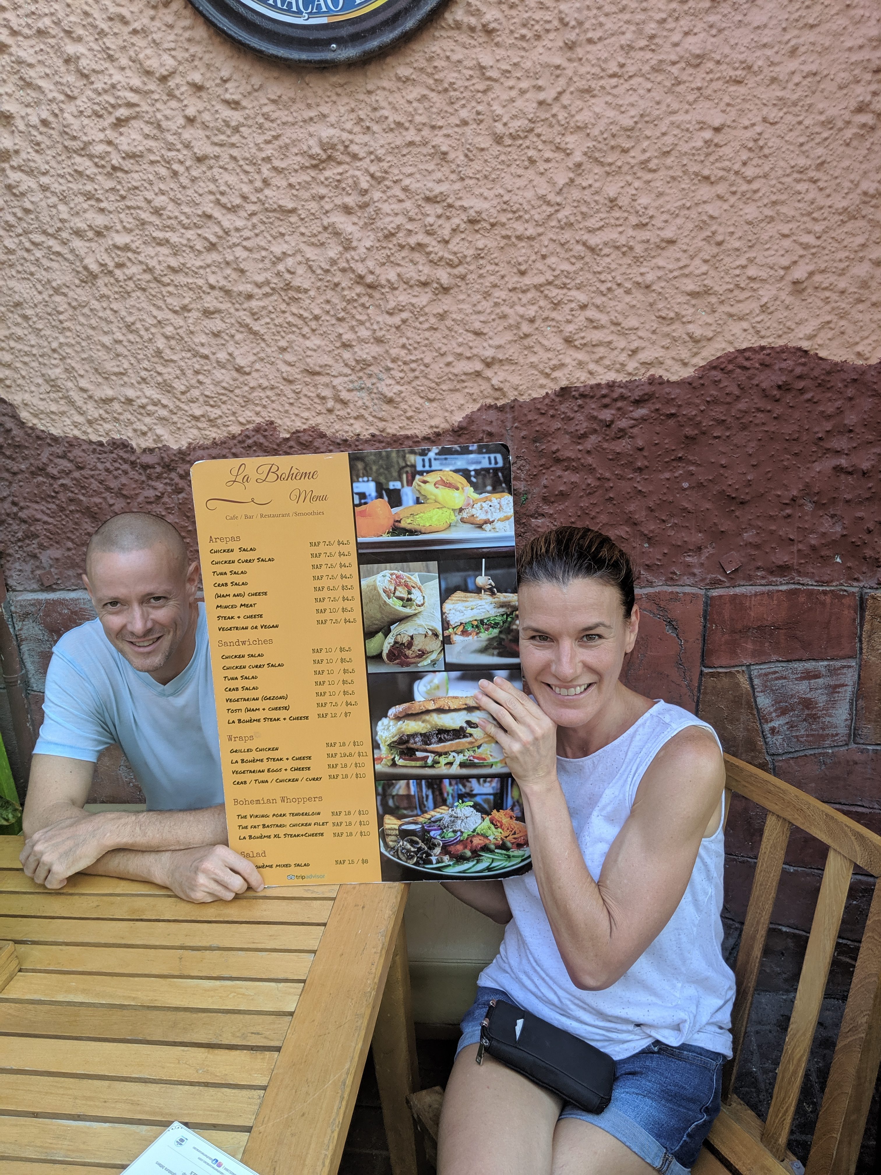 This night we went to La Boheme to try it out. We were given the largest menu I’ve ever seen, seriously! I took a picture with it, and Cody humored me! This restaurant was a little tricky for me since I can’t eat gluten, but I got a salad plate and Cody opted for a wrap. We were told to order the drinks with the “oldest rum” so that it would be the strongest drink. I’m not sure why the waiter felt we needed to get drunk, but we ordered the two drinks that he suggested. I took two sips and decided to revert to wine. Cody enjoyed both drinks.