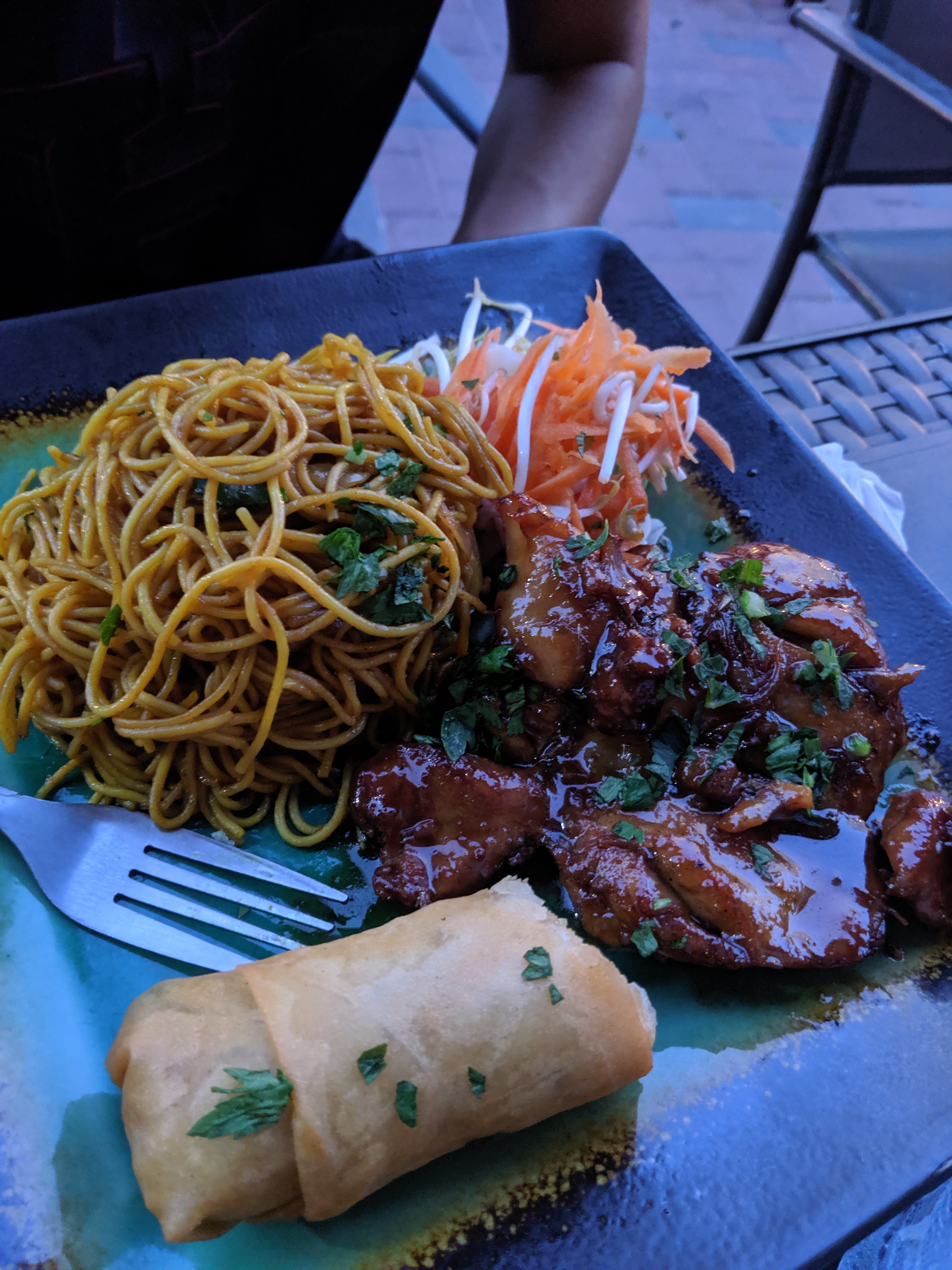 The menu is split into Indonesian, Thai, and Surinam. We dined on sate ayem, mid goreng, and gado-gado. The peanut sauce had what I believe to be kecap manis, or a sweet soya sauce, in it. I found it to be a bit unusual, but still good.