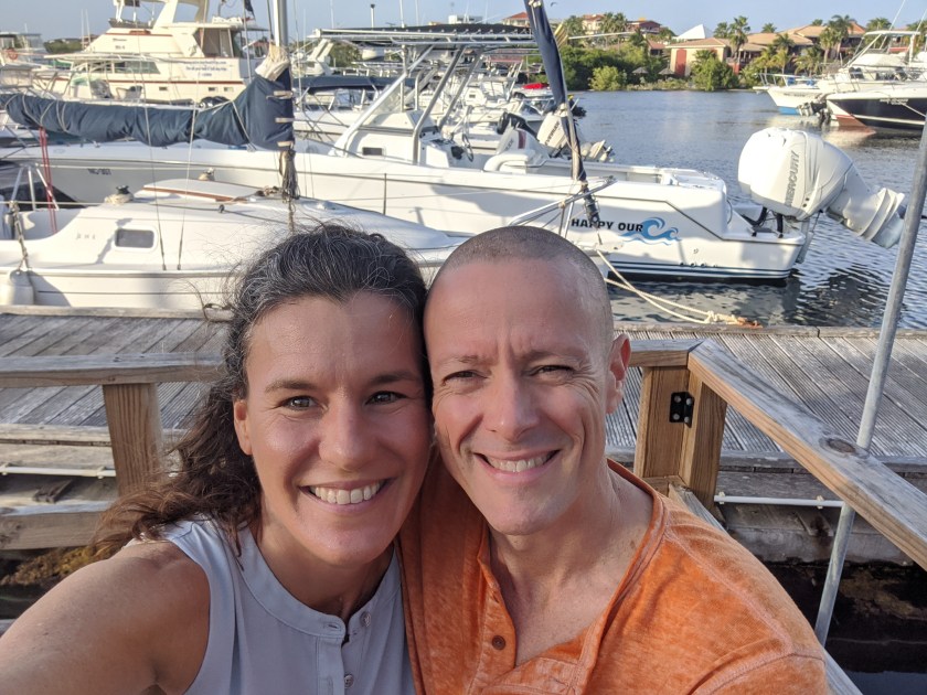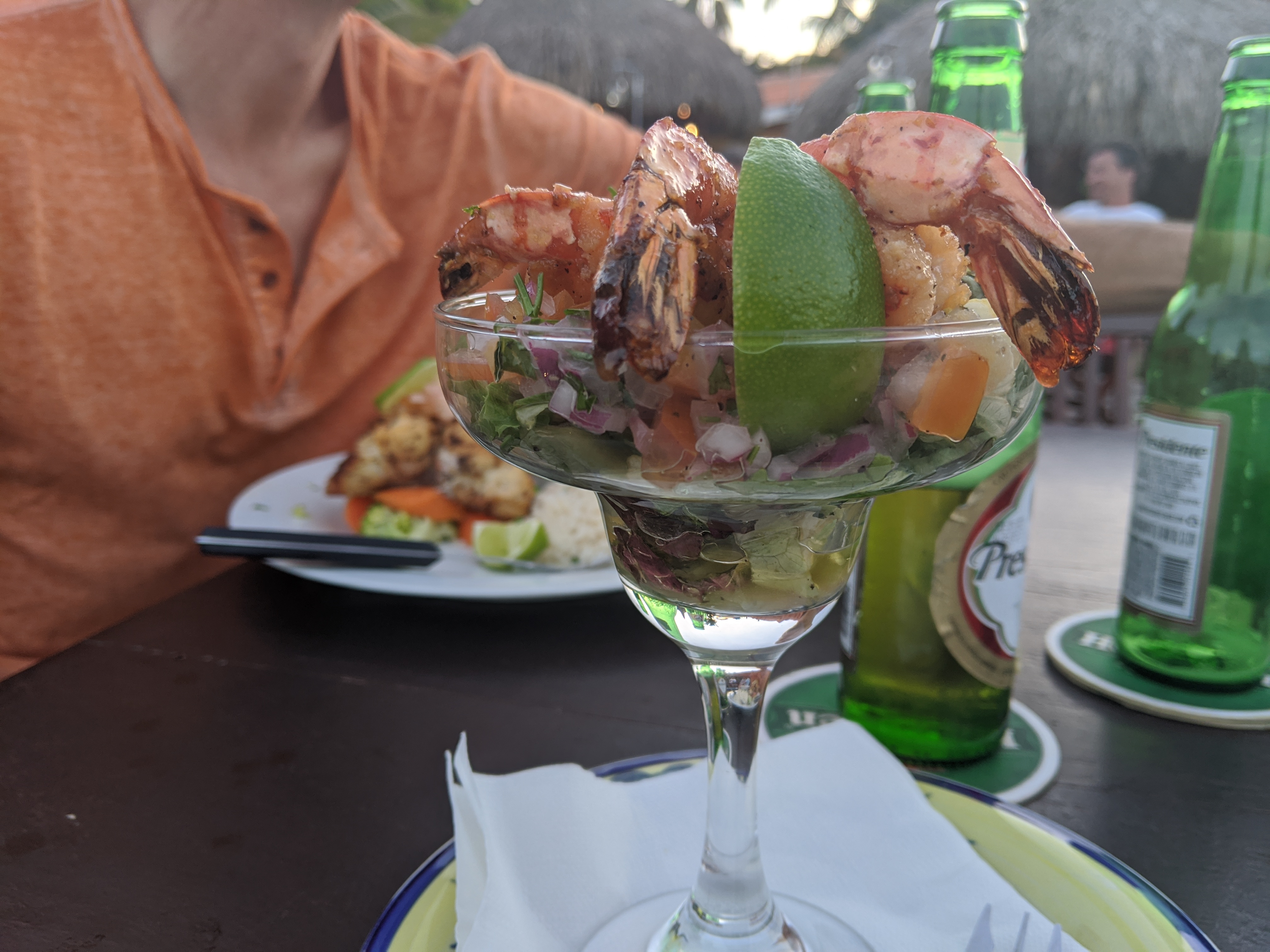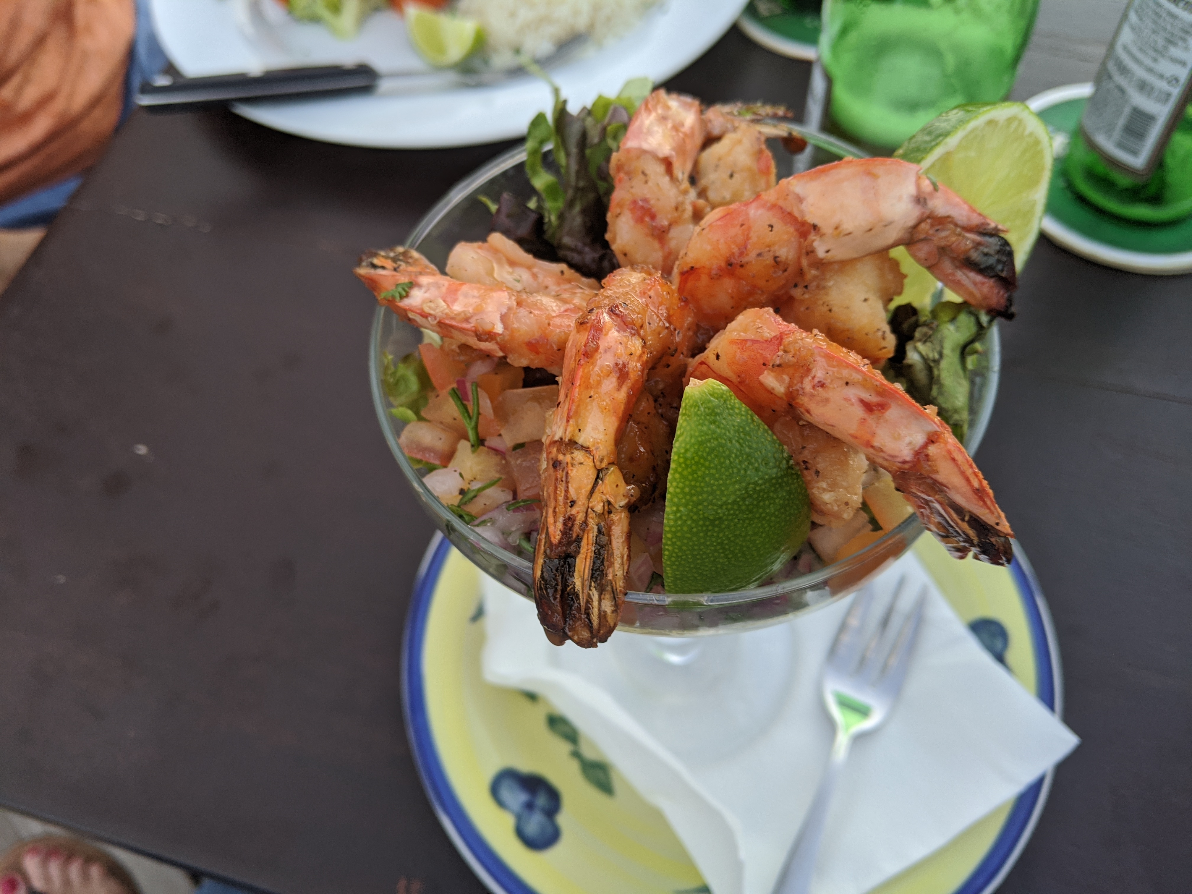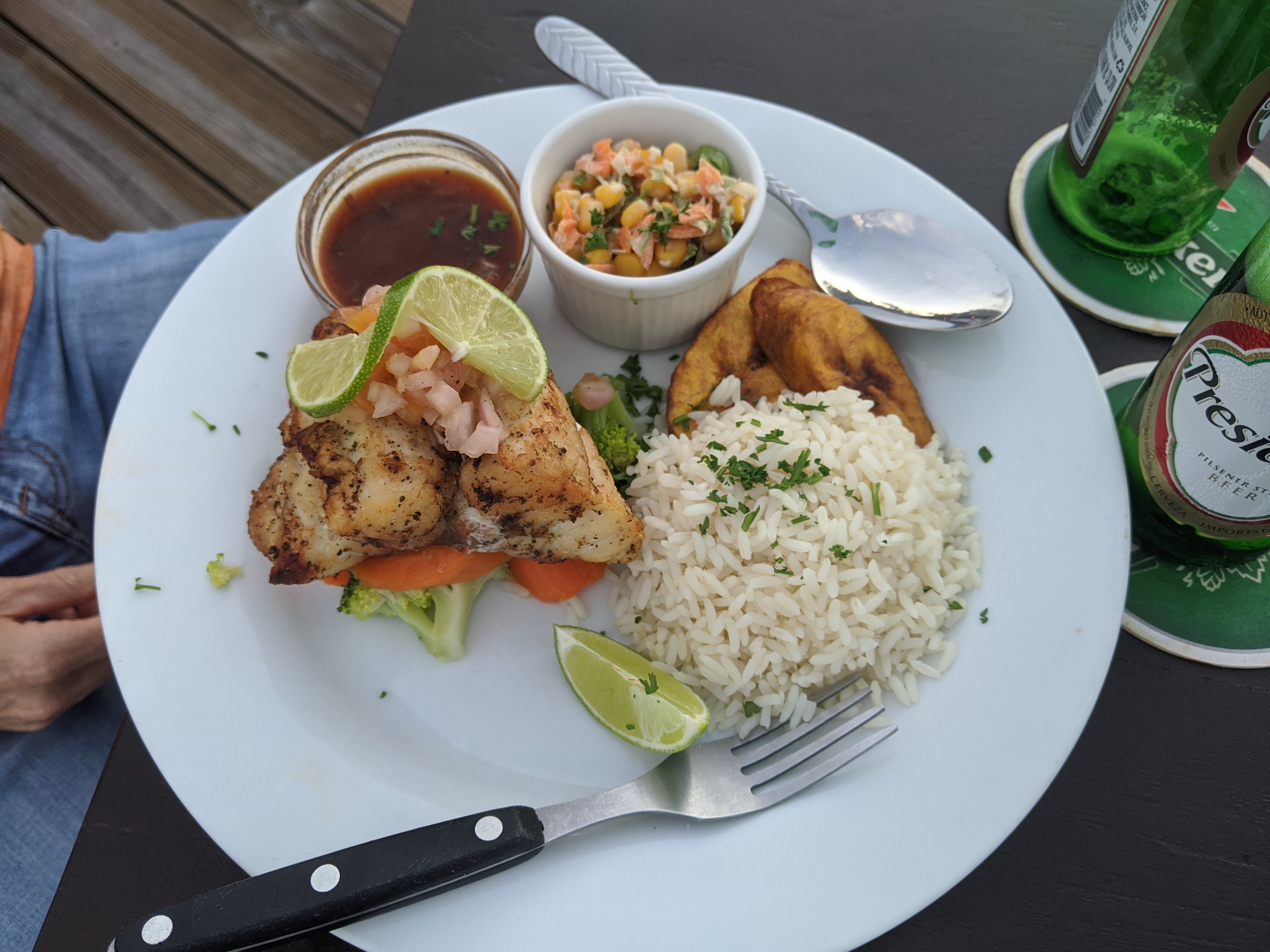 The food at Taboosh! is mostly Caribbean. They did have a special fish of the day, but the whole menu was seafood-heavy, which works for us. Yesterday, the special was red snapper with tomato sauce, steamed vegetables, corn slaw, and fries. Cody, of course, ordered that but substituted rice. I, the picky one, ordered the garlic shrimp hors d’oeuvre. It was simply delicious! The food itself was normally priced for the island, though the beer was a bit pricey.