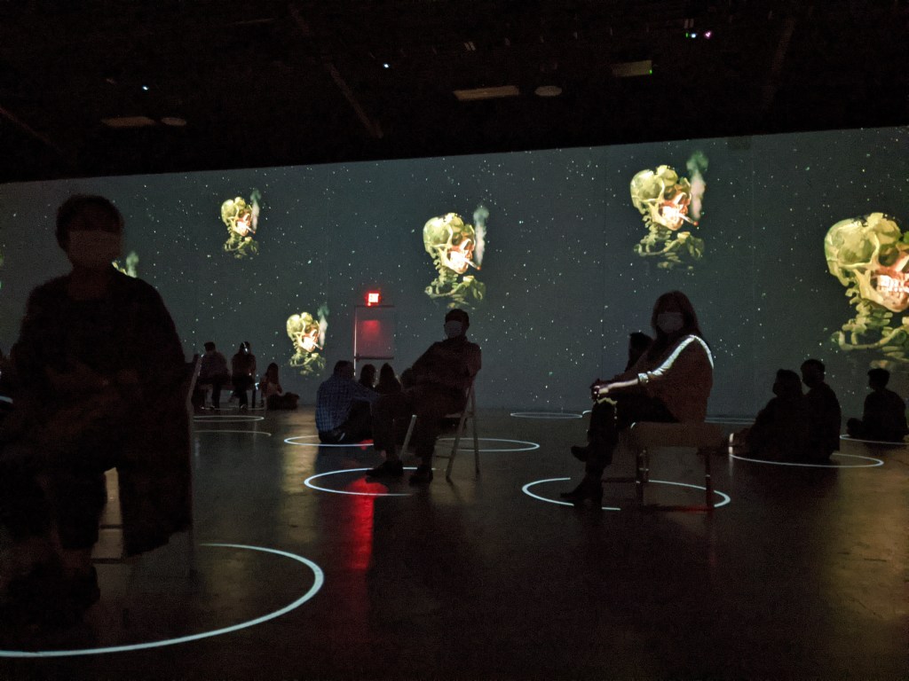 When we went inside, masks were required and there was a search (a sign of the times, but glad they checked). We were guided into “the room” to find a seat. You were supposed to sit in one of the lit circles on the floor. Each circle can hold quite a few people. The majority of the people sat on the floor, but there were a few benches and chairs.